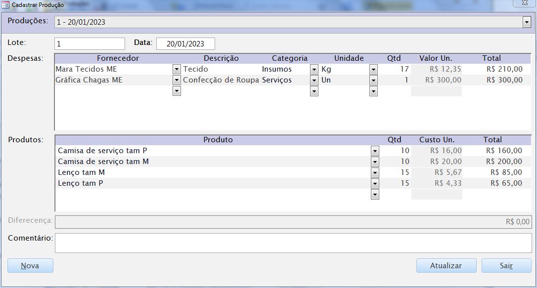 O sistema conta também com lançamento de produção de uniformes, são lançados os insumos e peças produzidas para cada lote, permitindo-se calcular o preço de venda de cada peça, na proporção do custo da produção.