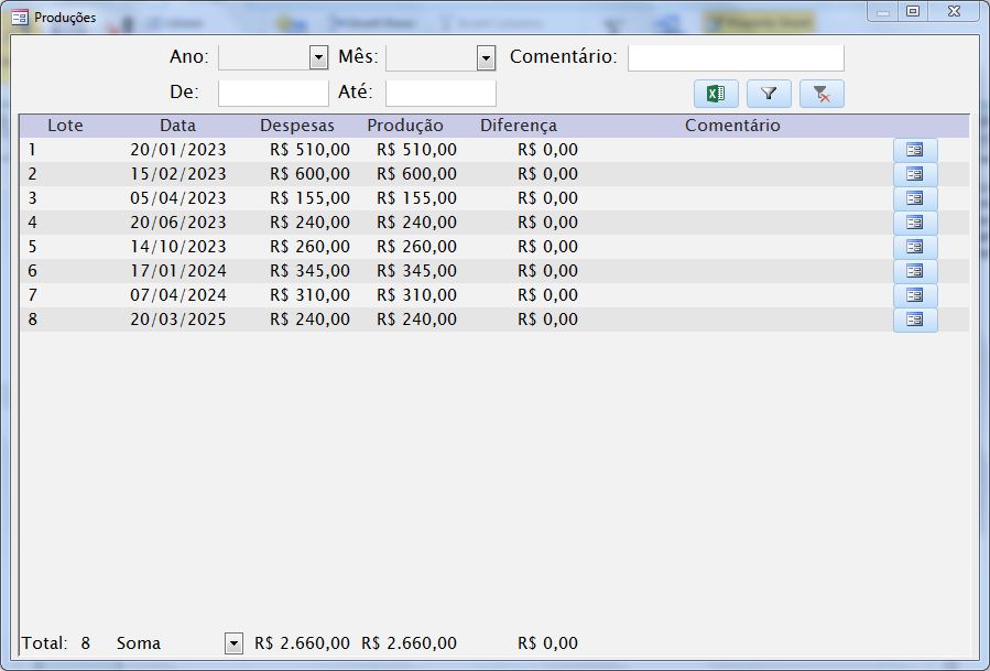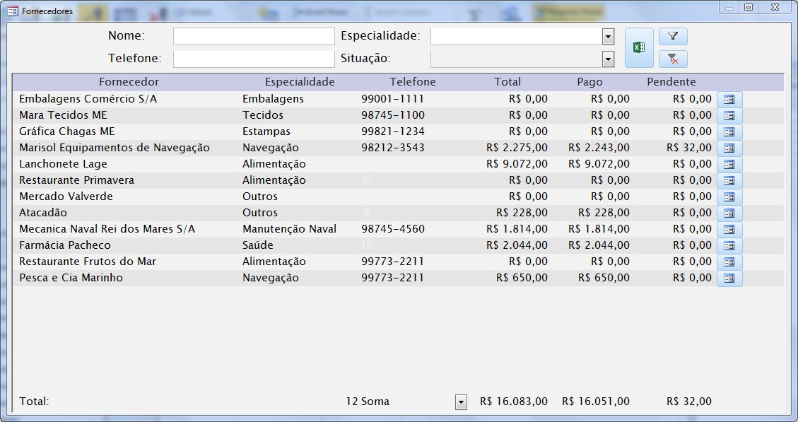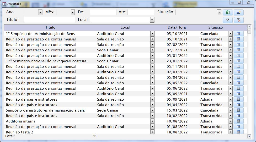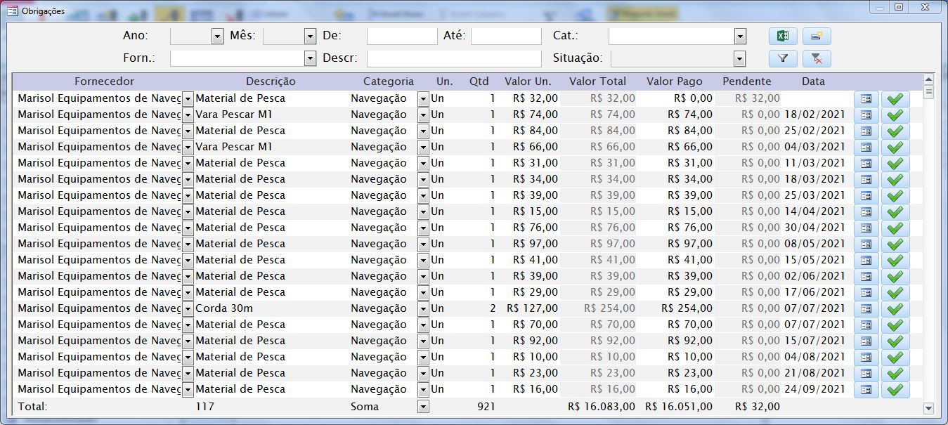 Além dessas funcionalidades o sistema conta ainda com controle de atividades, controle de obrigações e ainda gráficos e relatórios em uma planilha em excel diretamente vinculada ao banco de dados do access.