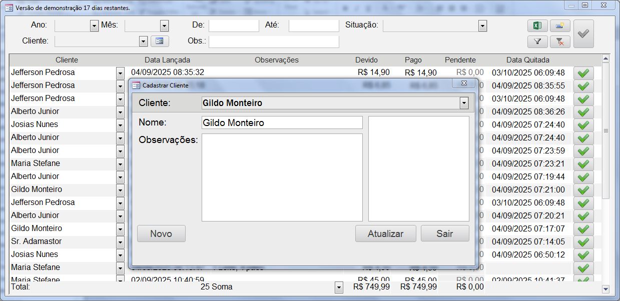 Nossos sistema de controle de vendas à prazo visa justamente atender essa necessidade. Bastante simples e intuitivo, ele facilita tanto o lançamento das vendas quanto dos pagamentos.