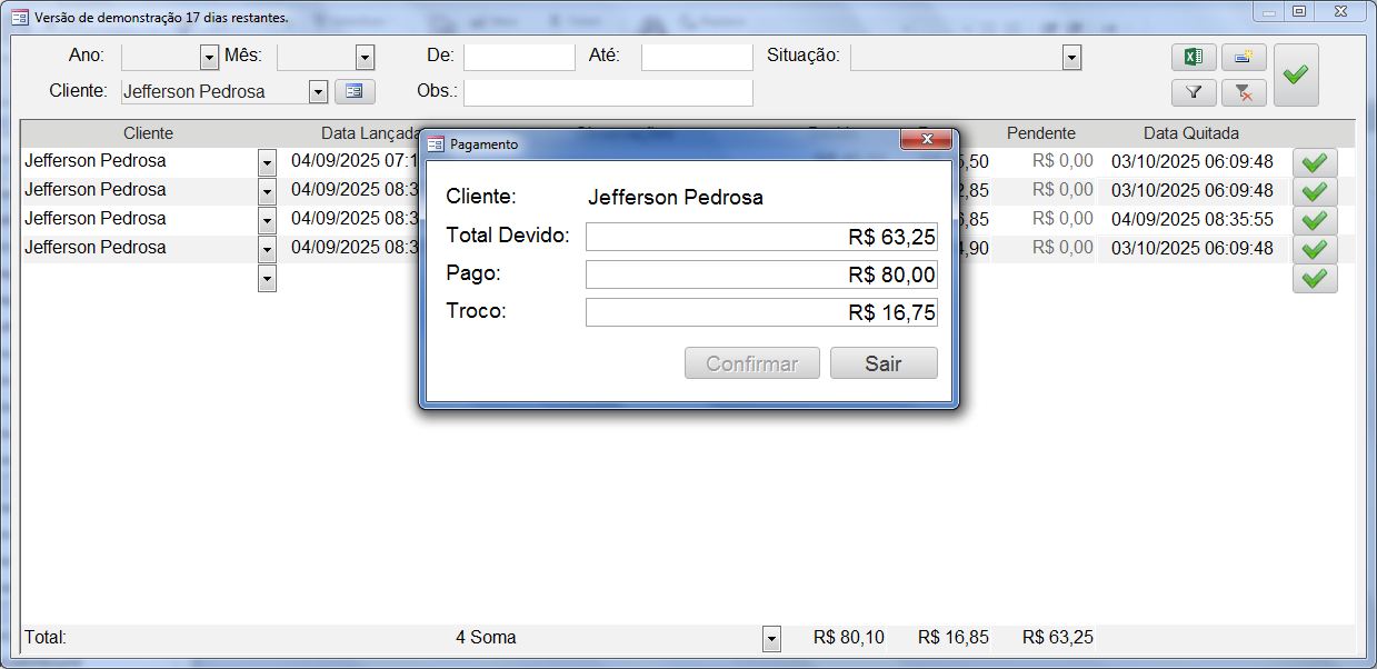 No momento de receber o pagamento, basta selecionar o cliente desejado no filtro correspondente que o total devido pelo cliente será automaticamente calculado e apresentado no extremidade inferior da janela e o botão de pagamento será habilitado. Após clicar no botão, surgirá a janela de pagamento. Caso a quantia paga seja superior ao total devido, o valor do troco é apresentado. Confirmado o pagamento o sistema registra os valores pagos.
